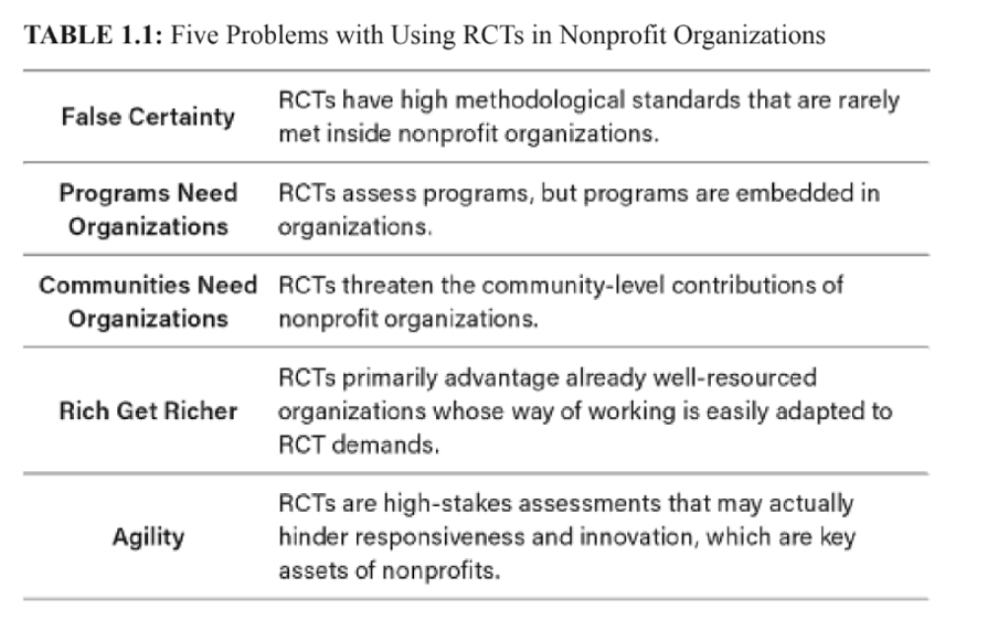 In their book Mismeasuring Impact: How Randomized Controlled Trials Threaten the Nonprofit Sector, Marwell and Mosley argue there are five main reasons RCTs are not always the best evaluation instrument.